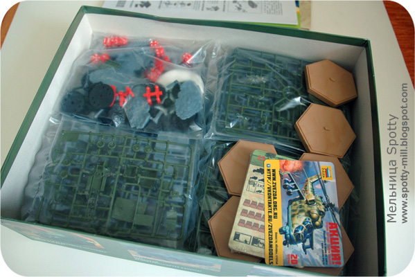 Коробка нестандартного размера от компании «Звезда» оформлена очень стильно: картина боя на крышке, зелёная цветовая гамма, фотографии собранных моделей, которыми предстоит управлять игрокам. При этом качество картона и полиграфии на самом высоком уровне. Давайте откроем коробку и посмотрим, с чем нам предстоит иметь дело.