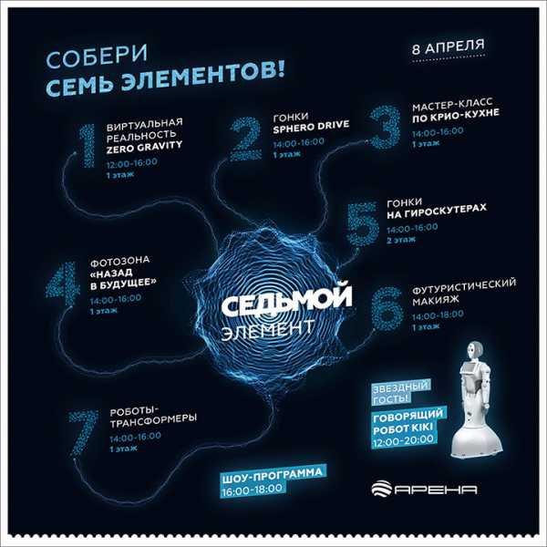 8 апреля торгово-развлекательный комплекс отмечает свое семилетие и приглашает на фантастический праздник «Седьмой элемент». С 14:00 до 18:00 все посетители «Арены» смогут перенестись в будущее и принять участие в высокотехнологичных развлечениях! Для «ранних пташек» также приготовлены приятные сюрпризы.
