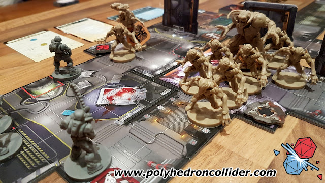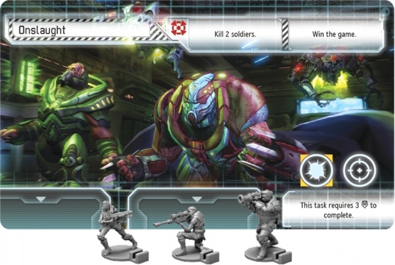 Механика же накидывания успехов (а они на двух гранях из шести) напоминает банальный push your luck с неким абстрактным уровнем угрозы. Угроза эта отмечается на специальном треке и в начале розыгрыша любого задания равняется единице. С каждым повторным броском угроза растёт на одно деление. Зачем она нужна? Дело в том, что вместе с синими кубами бросается красный кубик пришельцев.